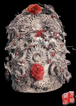 乾隆末年,清朝金匠林楚光主創(chuàng)并鑲刻了一頂巧奪天工之作——銀鑾金冠,這就是蜚聲中外的清·嘉慶銀鑾金冠,是乾隆專為嘉慶登基大典時(shí)所備的大禮。它高20厘米,寬12厘米,長(zhǎng)14厘米.重636克。冠上整體造型別致,結(jié)構(gòu)精堪,有巧奪天工之美、鬼斧神工之妙,令人拍案叫絕!
